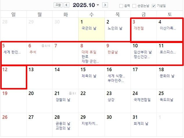 올해 10월은 3일 개천절부터 5~7일 추석 연휴, 8일 대체공휴일, 9일 한글날까지 이미 7일 연휴가 이어진다. 만약 여기에 금요일인 10월 10일이 임시공휴일로 지정되면 주말(11~12일)을 붙여 무려 ‘10일’에 이르는 초특급 황금연휴가 완성된다.