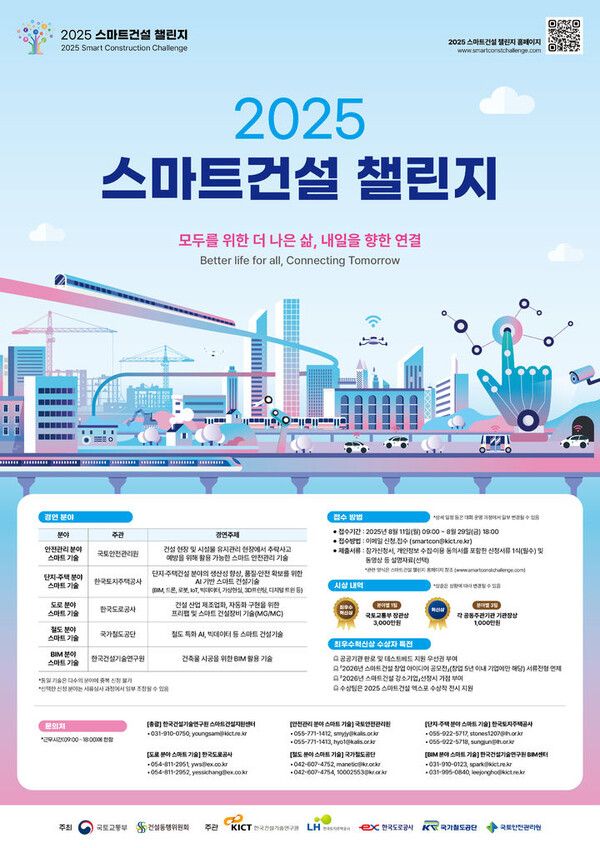 국토교통부(장관 김윤덕)는 건설산업 혁신을 이끌 첨단 스마트 건설기술을 발굴하기 위해 ‘2025 스마트건설 챌린지'를 개최한다고 11일 밝혔다.