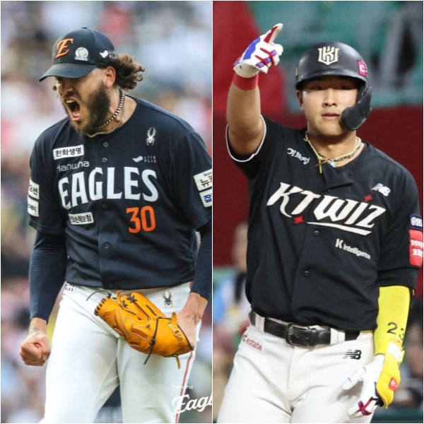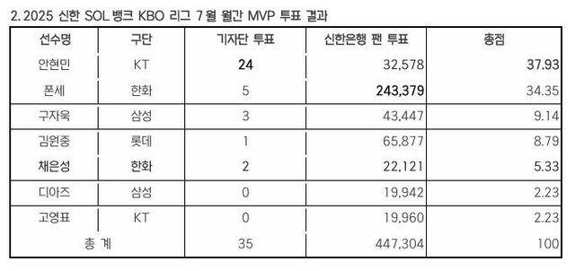 안현민과 폰세의 뒤를 이어 삼성 라이온즈 구자욱(총점 9.14) 롯데 자이언츠 김원중(총점 8.79점) 한화 채은성(총점 5.33) 삼성 디아즈(총점 2.23) KT 고영표(총점 2.23)가 각각 이름을 올렸다.
