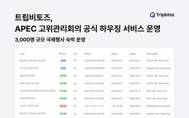 트립비토즈는 7월 26일부터 8월 15일까지 인천 송도에서 열린 ‘APEC 2025 KOREA 제3차 고위관리회의(APEC SOM3)’에서 공식 하우징 운영사로 참여했다. 외교부·산업통상자원부·인천광역시가 공동 주최한 이번 행사에는 약 3,000명의 국내외 고위급 인사와 실무진이 참석했다. 트립비토즈는 이들의 숙박 전 과정을 전담하며 안정적 운영과 기술력을 동시에 입증했다.
