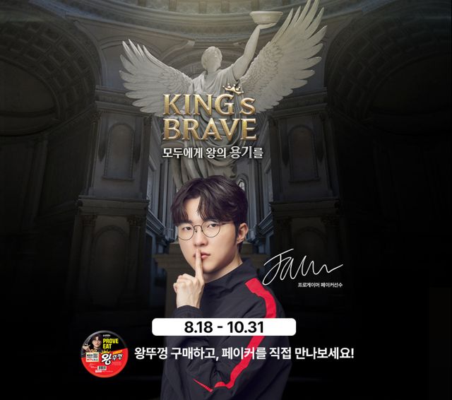 킹스브레이브는 ‘왕의 용기’를 뜻하는 브랜드 슬로건이다. 왕뚜껑의 콘셉트와 페이커의 도전 정신을 결합해 소비자 소통을 강화하고자 기획했다.