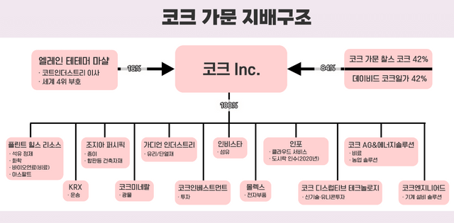 코크는 비상장 기업의 특수성 덕분에 외부 간섭 없이 철저히 가문 중심 지배력을 어렵지 않게 유지하고 있다. 코크 가문 핵심 사업체이자 그룹 지주사인 코크 지분 구조는 매우 단순하다. 찰스와 데이비드 일가가 각각 42%씩 총 84%를 쥐고 있다. 나머지 16% 지분은 '엘레인 테테머 마샬(Elaine Tettemer Marshall)'이라는 인물이 보유하고 있다. 코크 가문 출신이 아닌 엘레인이 코크 지분을 보유하게 된 과정은 복잡하다. 남편의 부친, 즉 시아버지 '하워드 마샬 2세(Howard Marshall II)'은 과거 자신이 대주주로 있던 '그레이트 노던 오일(Great Northern Oil Co.)'이 코크에 매각되는 과정에서 지분을 넘기는 대가로 코크 지분을 받았다. 당시 받은 지분은 아들 '피어스 마샬(Pierce Marshall)'을 거쳐 며느리인 엘레인에게 상속됐다. 현재 엘레인은 미국 내 가장 부유한 여성 순위 4위에 이름을 올리고 있다.