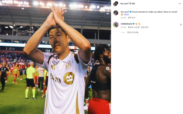 지난 7일 LAFC에 공식 입단한 손흥민은 사흘 뒤인 10일 시카고 파이어FC와의 원정 경기 출전 명단에 이름을 올렸다. 이어 팀이 1-1로 맞선 후반 16분 교체 투입돼 그라운드를 밟아 데뷔전까지 소화했다. 팀이 1-2로 뒤진 순간에는 빠른 스피드로 상대로부터 페널티킥을 유도하는 존재감을 뽐냈다. 손흥민은 경기 뒤 자신의 소셜미디어(SNS)를 통해 팬들을 향한 감사 인사를 전하기도 했다.