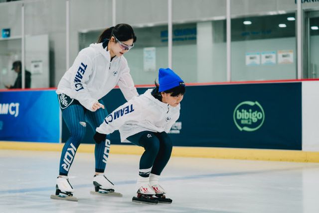 오후에는 웨이브즈 아이스링크로 자리를 옮긴 뒤, ‘팀 민선’과 ‘팀 희단’으로 팀을 나눠 실전 중심의 원포인트 레슨을 진행했다. 김민선과 정희단은 팀원 한 명 한 명과 손을 잡고 눈을 맞추며 기본 자세와 직선 및 코너 주행을 지도했다. 직접 시범을 보이며 세심하게 가르치는 두 선수의 모습에 학생들은 한 순간도 눈을 떼지 않고 집중했다.