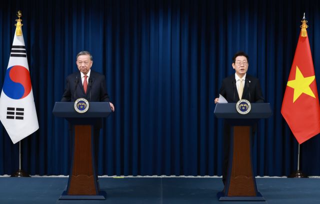 이 대통령과 또 럼 서기장은 11일 용산 대통령실에서 공동언론발표를 통해 "세계질서 변화에 실용적으로 대처하는 글로벌 책임 강국을 지향하는 대한민국과 2045년 고소득 선진국 진입을 추구하는 베트남 간의 협력이 그 어느 때보다 중요하다는 데 의견을 같이 했다"며 이같이 밝혔다.