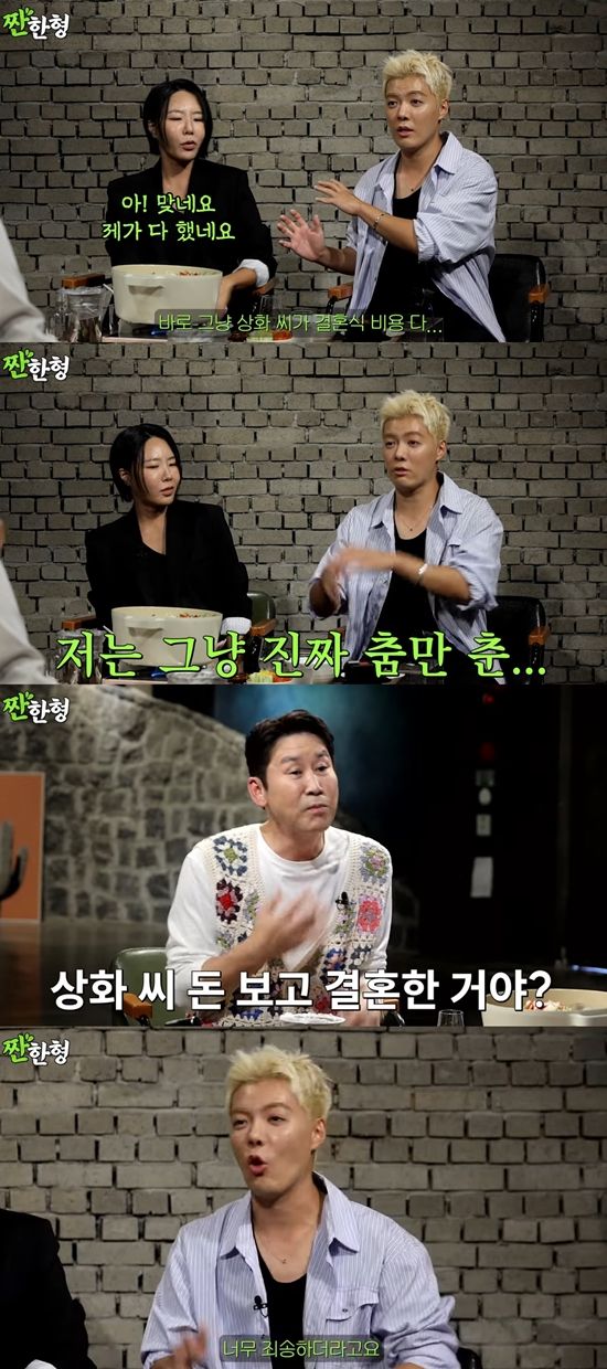 강남은 "그래서 상화 씨가 결혼식 비용 다 (냈다). 저는 진짜 춤만 췄다. 결혼식 비용과 미리 냈던 신혼여행 비용까지 (이상화가 냈다)"라며 이상화에게 미안한 마음을 드러냈다.