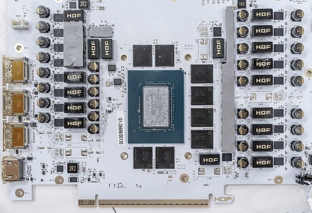 전원공급만 잘 되는 건 두 번째 조건이다. 첫 번째는 탄탄한 전원부 설계. HOF GAMING D7의 전원부는 다수의 페이즈로 나뉘어 GPU 코어와 메모리에 각각 최적화된 전압을 공급한다. 멀티페이즈 구성에 발열 분산과 전압 변동 억제에 유리하며, 특히 고주파 노이즈를 줄이기 위해 플래티넘 등급 초크 코일과 저ESR(Equivalent Series Resistance) 솔리드 캐패시터가 사용된다. GPU와 메모리 주변에는 별도의 파워플레인(Power Plane) 설계와 ENIG(금도금) 처리로 구리 산화를 방지해, 장기간 사용 후에도 접점 품질이 유지된다.