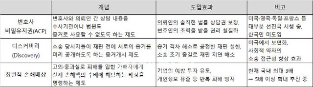 ACP와 함께 추진해온 디스커버리 제도 도입과 관련해서도 “이번에 적극적으로 반영될 것 같다”며 낙관론을 내놨다. 김 회장은 “디스커버리는 소송 전에 양측의 주요 증거들을 다 오픈해놓고 객관적으로 판단하는 제도”라며 “소 제기 전에 시시비비가 가려져 소송이 더 빨리 끝나는 경우가 많다”고 했다.