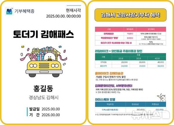 김해시는 연간 10만원 이상 고향사랑기부를 한 기부자에게 관내 관광·문화시설 이용시 다양한 할인 혜택을 제공하는 기부혜택증 '토더기 김해패스' 제도를 시행한다고 12일 밝혔다.