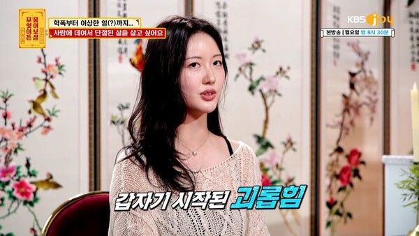 뉴시스 보도에 따르면, 11일 방송된 KBS 조이 예능물 '무엇이든 물어보살' 328회에서 사연자는 "학창 시절에 괴롭힘도 당하고, 살면서 이상한 일을 많이 겪어서, 사람이랑 단절된 채 살고 싶다"라며 이렇게 살아도 괜찮을지 고민이라고 전했다.