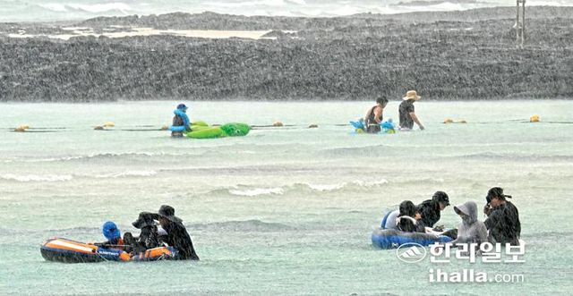 빗속에서 물놀이 즐기는 관광객. 한라일보DB