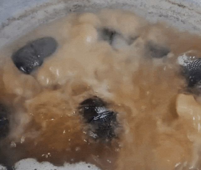 공개된 영상에는 큰 솥에 붉은 흙탕물처럼 보이는 물이 펄펄 끓고 있고, 그 속에 마이크 헤드 수십 개가 둥둥 떠있는 모습이 담겼다.