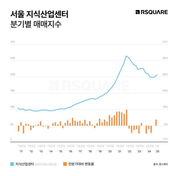 뉴시스 보도에 따르면, 12일 상업용 부동산 종합서비스 기업 알스퀘어에 따르면, 2025년 2분기 지식산업센터 매매지수(ROSI)는 201.1포인트로 전 분기보다 3.9% 상승했다. 다만 지난해 같은 기간과 비교하면 4.1% 하락한 수치다.