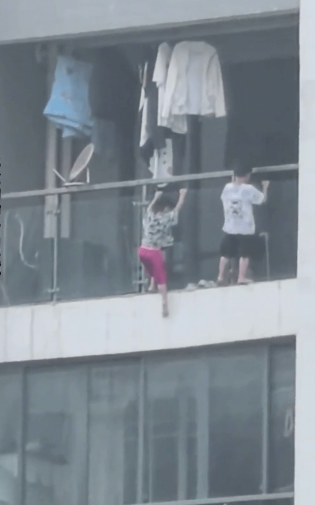 중국의 한 아파트에서 부모가 자리를 비운 사이 어린아이들이 베란다 난간에 매달려 노는 아찔한 상황이 벌어졌다. 다행히 주민들의 빠른 조치로 인명사고는 일어나지 않았다. (SNS)