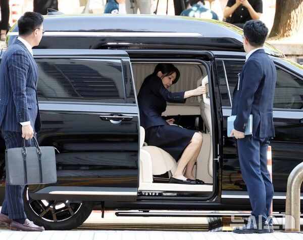 뉴시스 보도에 따르면, 김 여사가 탄 차량은 12일 오전 9시26분 서울중앙지법 서관 출입문 앞에 멈춰 섰다. 같은 차를 타고 온 변호인이 내린 후 김 여사가 카메라 앞에 설 때까지는 다소 시간이 걸렸다.