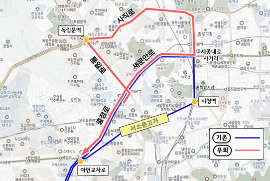 서울시는 서소문고가가 전면통제되는 다음달 21일부터는 서울시 지·간선버스, 심야버스 등 11개 노선을 우회 운영한다. 172번, 472번 등 서소문고가를 왕복 통과하던 5개 노선은 충정로~통일로~세종대로 등을 경유하는 경로로 우회한다. 600번, 602번 등 서소문고가를 편도로 통과하던 2개 노선은 세종대로~통일로~충정로를 이용해 우회 운영된다.