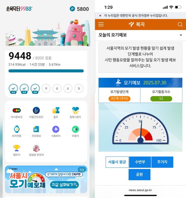 모기 예보 정보는 기존 서울시 홈페이지뿐 아니라 건강관리 앱 ‘손목닥터9988’에서도 확인할 수 있다. 야외활동이 잦은 시민들이 실시간 날씨처럼 모기 현황과 행동 요령을 간편하게 확인하도록 한 것이다. 예보 단계에 따라 “야외 활동 시 기피제 사용”이나 “집 주변 물웅덩이 제거” 같은 생활 팁도 함께 제공된다.