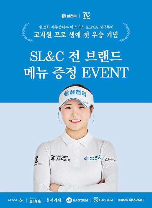 올해 창립 70주년을 맞이한 삼천리그룹에서 외식 사업을 전개하는 SL&C는 고지원 프로의 뜻 깊은 생애 첫 우승을 기념해 5만원 이상 구매 고객을 대상으로 ▲모던 중식당 ‘Chai797’이 유린기와 밀크티 ▲홍콩식 대중음식점 ‘호우섬’이 크런치 유린기와 밀크티, ‘살롱드호우섬’이 홍콩식 크림 유린기와 밀크티 ▲직화구이 전문점 ‘서리재’가 함흥냉면과 단호박식혜 ▲정통 에도마에 전문점 ‘이타마에 스시’가 혼마구로 사시미를 증정한다.