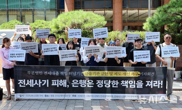 뉴시스 보도에 따르면, 전세사기·깡통전세 피해자 전국대책위원회와 문제해결을 위한 시민사회대책위원회는 12일 오전 서울 중구 명동 전국은행연합회 인근에서 기자회견을 열고 이같이 요구했다.