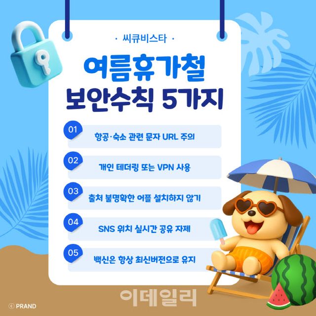 씨큐비스타가 제안한 ‘휴가철 5대 보안 수칙’은 ▲항공·숙소 관련 문자 내 URL 클릭 자제 및 발신처·도메인 확인 ▲공공 와이파이 대신 개인 테더링·VPN 사용 ▲출처 불명확한 앱 설치 금지 ▲SNS 위치 실시간 공유 자제 ▲OS·백신·보안 앱 최신 버전 유지 등이다.