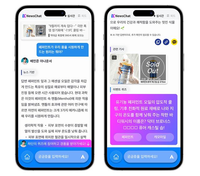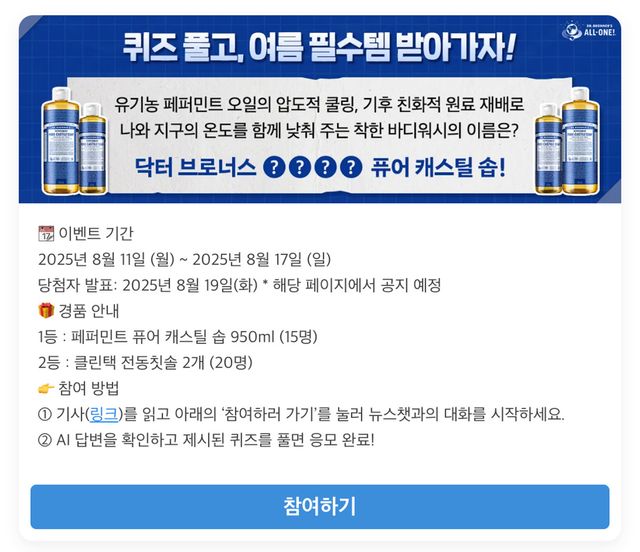 뉴스챗과 닥터 브로너스가 함께하는 퀴즈 이벤트는 8월 11일부터 17일까지 진행되며, 당첨자는 8월 19일에 발표된다. 1등 15명에게는 ‘페퍼민트 퓨어 캐스틸 솝’ 950ml가, 2등 20명에게는 클린택 전동칫솔 2개가 경품으로 주어진다. 참여 방법은 간단하다. 기사 하단 ‘참여하러 가기’ 버튼을 클릭해 뉴스챗과 대화를 시작한 뒤, AI가 제공하는 답변을 확인하고 퀴즈 정답을 입력하면 된다.
