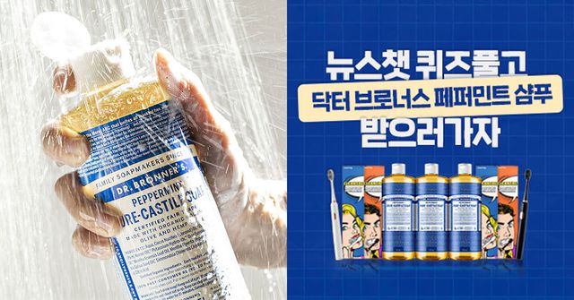이처럼 품절대란까지 겪고 있는 닥터 브로너스의 쿨링 바디워시 제품을 무료로 받을 수 있는 절호의 기회가 생겼으니 주목해 보자. 대화형 AI 뉴스 서비스 '뉴스챗'이 진행하는 퀴즈 이벤트 정답을 맞히면 페퍼민트 퓨어 캐스틸 솝 950ml 대용량을 받을 수 있는 것이다.