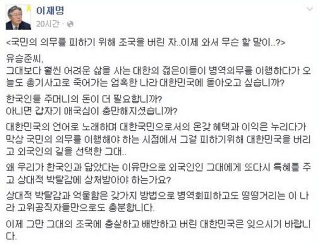 당시 이 대통령은 “그대보다 훨씬 어려운 삶을 사는 대한민국의 젊은이들이 병역 의무를 다하다가 오늘도 총기사고로 목숨을 잃고 있다. 그런 나라에 돌아오고 싶은가? 한국인들의 주머니 돈이 필요해서인가, 아니면 갑자기 애국심이 생긴 것인가”라고 날을 세웠다. 이어 “대한민국의 언어로 노래하며 온갖 혜택을 누리다가 막상 병역 의무를 이행할 시점이 되자 외국인 신분을 선택한 사람에게 왜 또다시 특혜를 줘야 하느냐”며 “상대적 박탈감과 억울함은 이미 병역 회피를 하고도 떵떵거리는 고위공직자들만으로도 충분하다. 이제 그만 그대의 조국에 충실하고, 배반한 대한민국은 잊으라”고 썼다.