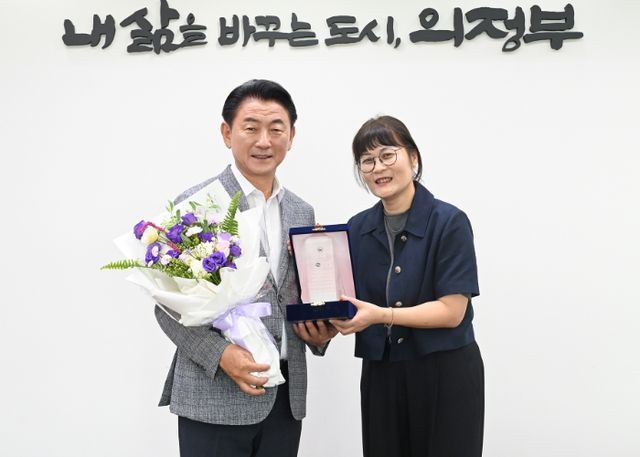 | ▲ 김동근 시장이 8월 12일 지역 장애인 복지 발전에 기여한 공로로 의정부시장애인종합복지관 송경주 관장에게 감사패를 받은 뒤 함께 기념사진을 찍고 있다. |