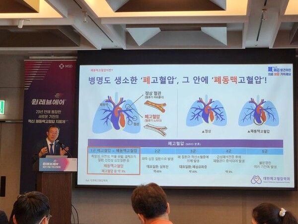 이날 간담회에서 대한폐고혈압학회 정욱진 회장은 "폐동맥 고혈압은 단순히 혈관이 수축된 상태가 아니라, 폐소동맥의 벽이 두꺼워지고 내강이 좁아지면서 구조적으로 협착되는 질환"이라며 "일반적이 고혈압과는 다르다"고 설명했다.