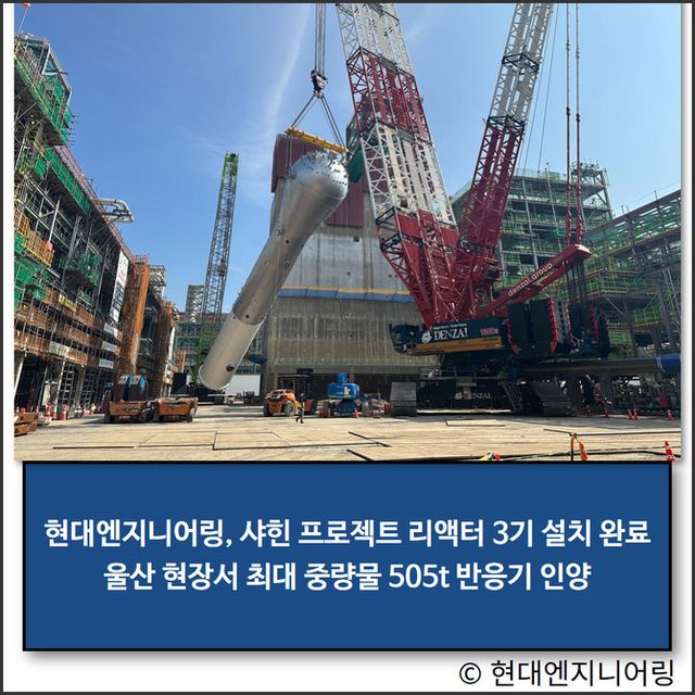 현대엔지니어링은 높이 46m, 지름 5.5m, 무게 505t에 달하는 리액터의 설치를 위해 1800t급 크롤러 크레인과 600t급 테일 크레인을 동원했다. 설치는 리액터를 약 80m 높이까지 인양해 현장에 설치된 철골 구조물 기초부에 안착시키는 방식으로 진행됐다.
