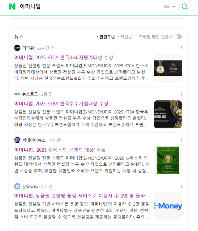 '이머니업, 2025년 K-베스트브랜드 대상 수상', '이머니업, 2025 KTCA 한국소비자평가대상 수상' 기사(현재된 삭제된 상태) ⓒ 프라임경제