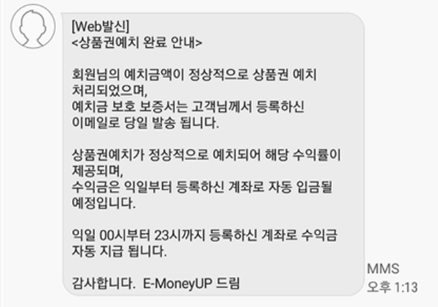 본지가 입수한 이머니업 상품권예치 완료 문자 메시지 ⓒ 프라임경제