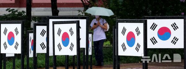 [서울=뉴시스] 제80주년 광복절을 사흘 앞둔 12일 대구 동구 대구경북항일독립운동기념탑 입구 회전교차로에 태극기가 설치 돼 있다.