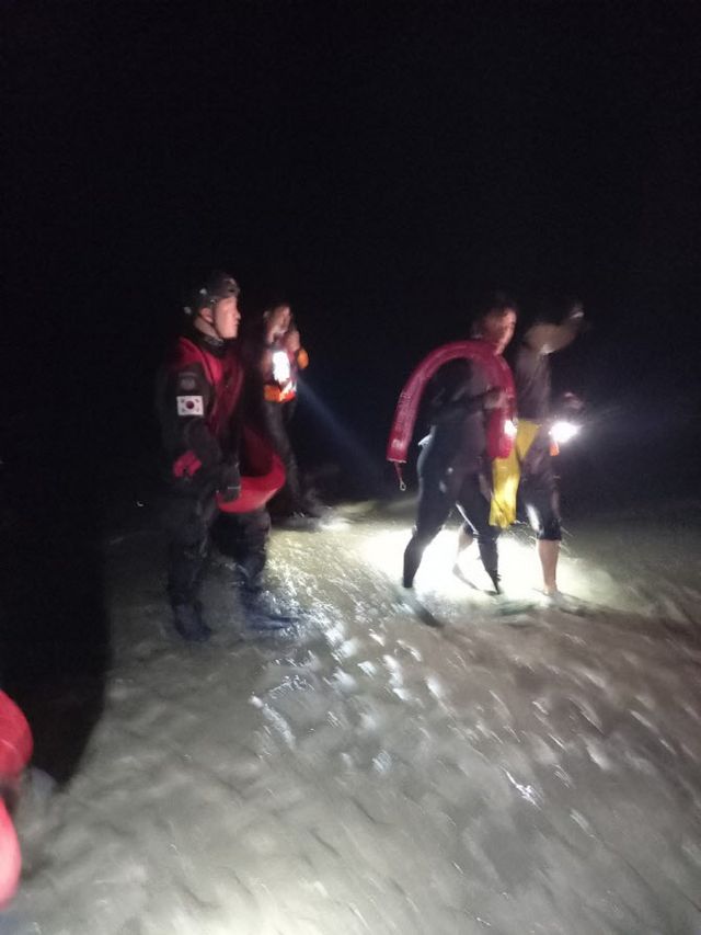 이 소방위는 “신고자를 안심시키며 수색을 시작했고, 신고자가 진입했던 방향을 기준으로 해변 라이더의 라이트와 랜턴을 밝혀 가며 수색을 시작한 지 약 10분여 만에 신고자 위치를 확인할 수 있었다”며 “그러나 물이 급속히 차올라 해변 라이더로는 접근이 불가능해 구명튜브를 들고 신고자가 있는 곳으로 직접 접근했다. 구조 튜브로 부력을 확보한 뒤 구조 대상자를 약 180m 수영으로 이동해 안전하게 해변으로 구조했다”고 설명했다.