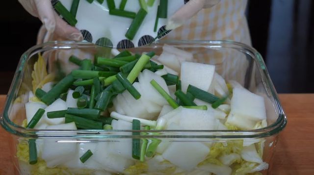 버무리기 절여진 알배추는 찬물에 여러 번 헹구어 짠맛을 빼고 물기를 뺀다. 절임과 헹굼이 끝난 알배추, 무, 대파를 양념장에 넣고 조심스럽게 버무린다. 너무 세게 버무리면 알배추의 아삭한 식감이 손상될 수 있으므로 주의한다.