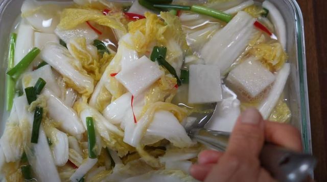 알배추물김치는 냉장 보관이 기본이며, 김치통의 뚜껑을 꼭 닫아 외부 공기와의 접촉을 최소화해야 신선도를 유지할 수 있다. 또한, 김치통 위에 무거운 접시나 돌 등을 올려 눌러주면 재료가 공기 중에 노출되는 것을 줄여 산패를 막는다.