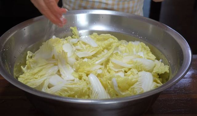 알배추는 깨끗이 씻은 후 3~4cm 길이로 자른다. 찬물에 여러 차례 헹구어 불순물을 제거한다. 큰 그릇에 알배추를 넣고 천일염을 뿌려 고루 버무린 뒤, 약 2~3시간 동안 절인다. 절이는 동안 중간중간 뒤집어 골고루 절이도록 한다.