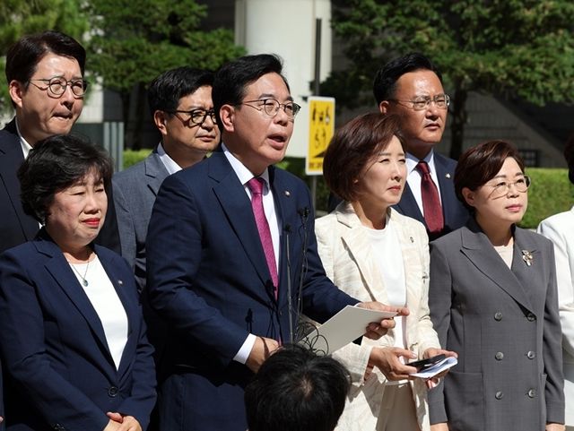 송언석 국민의힘 비상대책위원장 겸 원내대표와 의원들이 지난달 11일 오후 서울 서초구 서울중앙지방법원에서 특별검사팀의 의원실 압수수색을 규탄했다. / 뉴스1