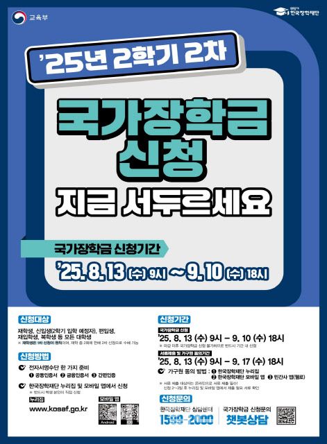 교육부와 한국장학재단은 이날부터 오는 9월 10일까지 ‘2025학년도 2학기 2차 국가장학금 통합 신청’을 받는다고 밝혔다.