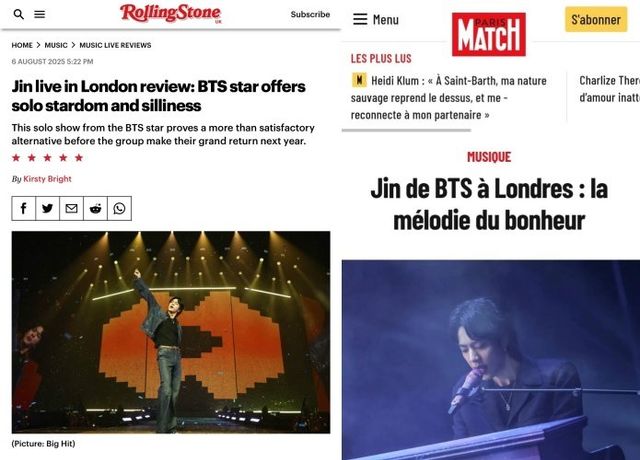 영국 롤링스톤은 진을 “세상에 단 하나뿐인 독보적인 엔터테이너”라 평가하며 별 다섯을 안겼다. 세계계 음악계가 진의 무대와 존재감을 공식 인정한 순간이었다.