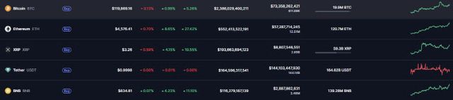 글로벌 가상자산 시황중계 사이트 코인마켓캡에 따르면 13일 오전 7시 45분 기준 비트코인 가격은 24시간 전 대비 0.99% 오른 11만 9869달러를 기록했다. 일주일 전과 비교하면 5.26% 올랐다. 알트코인(비트코인 외 가상자산)의 대표격인 이더리움은 전일 대비 8.65% 상승한 4576달러에 거래됐다. 일주일 전과 비교하면 27.42% 올랐다.