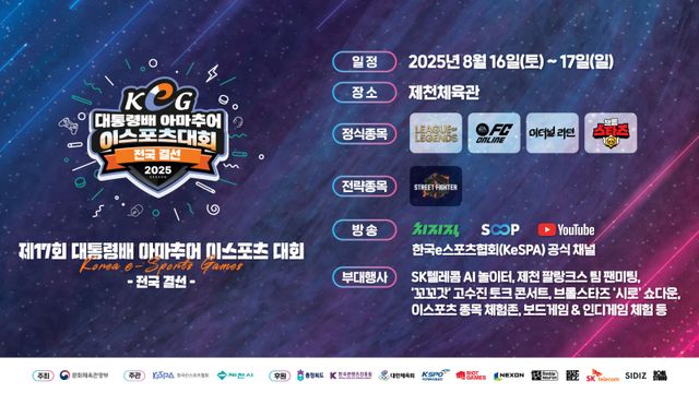 종목별 상금은 ‘리그 오브 레전드’ 500만원, ‘FC 온라인’ 500만원, ‘이터널 리턴’ 800만원, ‘브롤스타즈’ 800만원, ‘스트리트 파이터 6’ 200만원이다. 특히 ‘FC 온라인’ 전국 결선 입상자에게는 ‘2025 FC 온라인 퓨처스 리그’ 서머 본선 시드권이 부여된다.