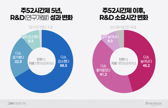 이에 따르면 기업 연구부서의 75.8%가 '주52시간제 시행 후 연구개발 성과가 줄어들었다'고 응답했다. 4곳 중 3곳이 연구개발 성과가 줄었다고 답한 것이다. 또한 조사 대상 기업의 53.5%는 주52시간제 시행으로 인해 '연구개발 소요시간이 늘었다'는 답변을 내놨다.