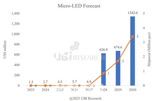 유비리서치가 최근 발간한 ‘2025 마이크로 LED 디스플레이 산업 및 기술 동향 보고서’에 따르면 글로벌 마이크로 LED TV 생산 캐파는 2023년 연간 5만 대 수준에서 2030년 약 600만 대로 확대된다. 전체 마이크로 LED 시장 규모는 약 13억 달러(약 1조8000억원)에 이를 전망이다.