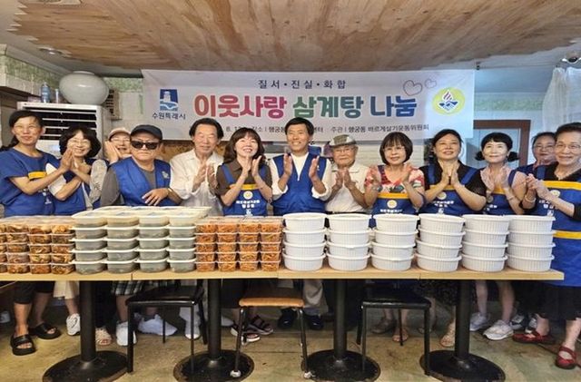 [와이뉴스] 수원시 팔달구 행궁동 바르게살기운동위원회는 12일 여름철 무더위로 지친 이웃들을 위해 ‘이웃사랑 삼계탕 나눔 행사’를 열고, 관내 취약계층 50가구에 삼계탕을 전달했다.