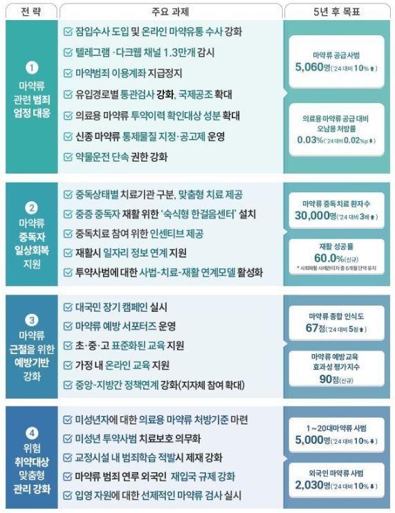 정부는 마약류 범죄 중 민생범죄로 확산될 수 있는 부분에 보다 엄정히 대응하기 위하여 제1차(’25~’29) 마약류 관리 기본계획 및 시행계획을 보강하기로 협의했다.