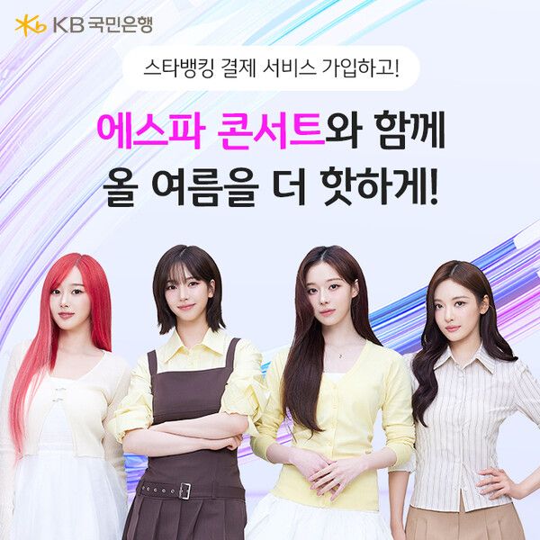 [폴리뉴스 김지혜 기자] KB국민은행은 '스타뱅킹 결제 서비스' 신규 가입 고객을 대상으로 인기 K-POP 그룹이자 2021년부터 5년째 KB국민은행 광고모델로 활동 중인 에스파 콘서트 티켓 증정 이벤트를 실시한다고 13일 밝혔다.