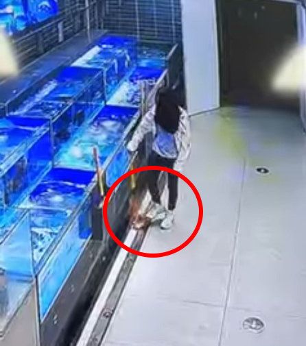 영상에는 여성이 뜰채로 물고기를 건져 올려 바닥에 내려놓고 자근자근 밟는 장면이 고스란히 찍혔다. 이후 밟은 고기를 다시 수족관에 넣고 눈치를 보며 다른 수조에서도 같은 행동을 반복했다.