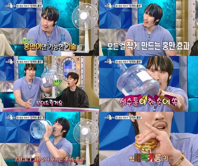 이어 그는 마치 1.3L짜리 생수병을 잡듯 한 손으로 들고 마시는 장면을 선보여 모두를 깜짝 놀라게 한다.