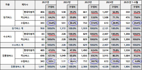 반면 수입 친환경버스의 보조금 수령 비중은 2023년 30.7%에서 2024년 13.5% 수준으로 줄었고, 올해 상반기 말 기준 6.8%에 불과했다. 같은 기간 누적 등록대수 기준 점유율 비중은 국산이 67%에서 66%, 수입산이 33%에서 34%로 거의 유사한 수준이지만 보조금 비중은 크게 변화한 셈이다.